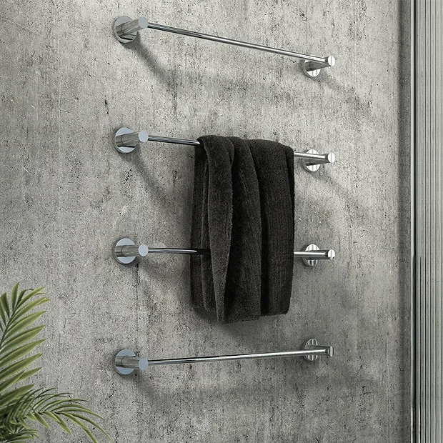 The stylish and practical wall mounted Arezzo 4-Bar Industrial Style Chrome towel rail features a minimalist round design which integrates seamlessly into any modern bathroom. This set consists of 4 individual rails each measuring 540mm in length, the spacing between each rail is fully adjustable to suit your preference. Crafted to the highest standards, the towel rail features knurled detailing perfect for creating an eye catching industrial look in your bathroom.