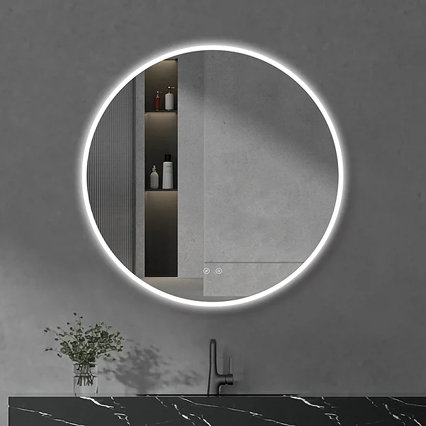 The contemporary Arezzo large 800mm round LED framed bathroom mirror, features a smart touch button on the screen surface for LED lighting and a de-mist pad which is designed to prevent the mirror from fogging.
