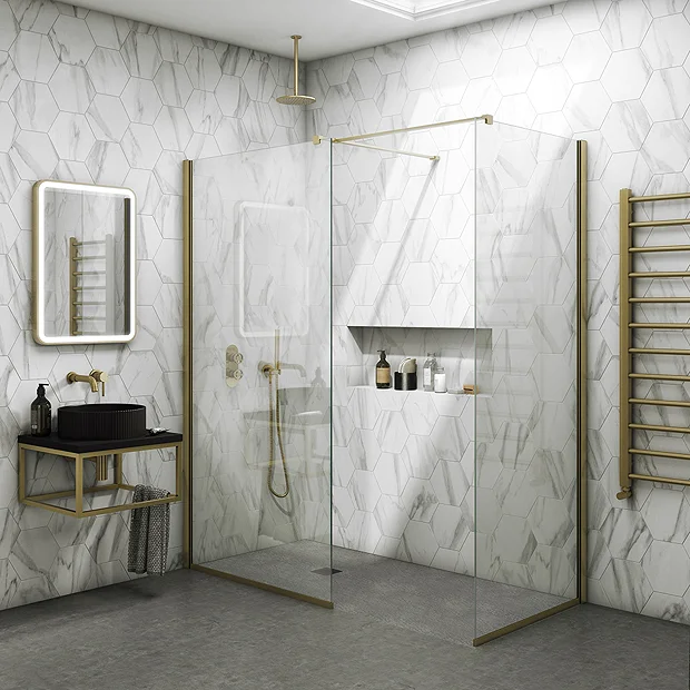 Create a focal point in your bathroom with the elegant Arezzo brushed brass square wet room screen with wall support arm. Bringing together classic style with quality, this bold and trendy brass framed shower screen is made with 10mm toughened safety glass. Ideal for creating an easy walk-in section in your bathroom for showering. The panel has an adjustable wall mounted profile to achieve the desired distance from the side wall.