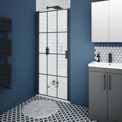 Arezzo 800mm Matt Black Grid Frameless Pivot Shower Door + Tray For Recess