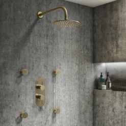 Arezzo Brushed Brass Round Concealed Triple Shower Valve With Fixed Head + 4 Body Jets